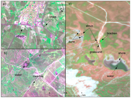 Field spectroradiometric measurements were acquired by the Remote Sensing and GIS Laboratory Doñana Biological station, Spanish Council for Scientific Research (LAST-EBD (CSIC)), following the Jiménez and Díaz-Delgado [64] methodology, which has been widely used in previous airborne and field campaigns [65,66]. The spectroradiometer used was an ASD FieldSpec3 (Analytical Spectral Devices, Boulder, CO, USA). The spectral range covers the VIS, NIR, and SWIR regions (350 nm–2500 nm), with a spectral resolution (Full Width Half Maximum, FWHM) of 3 nm for the VNIR region (350 nm–1000 nm) and 10 nm for the SWIR region (1000 nm–2500 nm), even though the sampling intervals are 1.4 nm and 2 nm, respectively [67]. Field spectroradiometry sampling areas were designed with a circular shape with a diameter of 20 m. Measurements were taken facing the Sun (to avoid self-shadows) and were collected by sweeping the circle in a zigzag pattern advancing towards the Sun; in the case of water, we made punctual measurements, while remaining as fixed as possible in the selected water area, following the protocols stated in Peña-Martinez et al. [68] and Mueller et al. [69]. The pointer was located in zenithal position at 150 cm above the ground (nadir view), resulting in a footprint of 65–70 cm (Figure 3a). 20 to 40 measurements were made at each sampling plot and its arithmetic mean, median, and standard deviation was calculated. The reflectance of each land cover was obtained by dividing the average target radiance by the average (10 scans) of a white (Spectralon) reference panel radiance [70]. The two measurements were acquired alternatively and the instrument dark current was measured before each sampling [71,72]. Together with the radiometric measurements, its metadata was taken on the field with a Trimble PDA NOMAD with GPS and Cybertracker software, storing the time, date, location, etc. The accuracy of the GPS is about 5 m, but the areas where the sampling points were made are large and homogeneous enough to be sure that there was no problem correlating with the appropriate pixels. In the present work, the sampling area was previously identified as a homogeneous and flat land cover, including shallow lake water with presence of filamentous algae (Cladophora fracta) (Figure 3b), sand of dune (Figure 3c), senescent wheat crops, albero (organic ochre sandy clay (Figure 3d)), loamy sand of the dry shallow lake littoral zone, open grasslands (mainly Vulpia membranacea and Malcolmia triloba), shrubs (Halimium halimifolium and Lavandula stoechas (Figure 3f)), grasslands (mainly Poa bulbosa and Trifolium subterraneum (Figure 3e)), or active fern vegetation. Regarding the sampling points within the National Park near Laguna Santa Olalla, they have been used previously by our team in studies with airborne hyperspectral sensors since 2008. It is a well-known area of easy access and with a diverse land cover, of an adequate size, and where the different covers are very close to each other, being able to go from a lake of permanent waters to a dune with very reflective sand in a few minutes (a key characteristic for radiometric studies), and all of this in a protected area with different kinds of natural vegetation. Regarding those located in Villanueva de los Castillejos, they were selected in order to also test over a different satellite orbit and covers (water bodies used for irrigation and to water cattle, large extensions of homogeneous grasslands, etc.). On the outskirts of the town, there is a soccer field covered of albero that was also considered potentially interesting, as well as diverse crop fields of easy access.