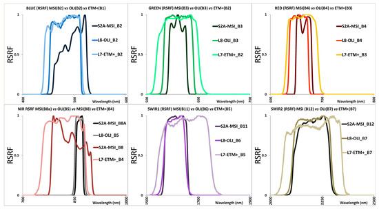 The Relative Spectral Response Function (RSRF) of the ETM+ [57], OLI [58], and MSI [59] instruments was used to integrate in-situ reflectance measurements (Figure 5). Although it is possible to obtain a synthetic value by computing a simple mean from the nominal FWHM bandwidth, it is worth using the available RSRF and accounting for the sensitivity of every band of the satellite sensor [88,89]. After resampling field spectroradiometry data to the satellite sensor sensitivity, spectral field measurements were taken as the reference for the comparison of the accuracies of the radiometric correction methods. The comparison was made according to the sensor (ETM+, OLI, or MSI) and acquisition date (May, October, April, June).