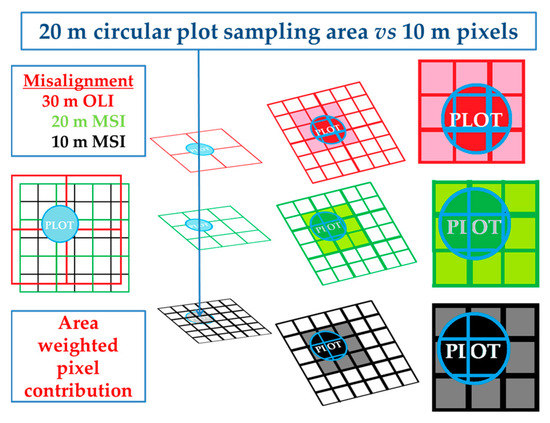 30 m and 20 m imagery was resampled to 10 m pixels to manage geometric issues (misalignment and different spatial resolutions). Then, a 10 m buffer from the center of field radiometry plot was done. This buffer is selecting a maximum of nine pixels of 10 m. The area intersected by the circle and each affected pixel is used to compute its contribution (weight) to the final reflectance value to be compared to the field radiometry. It is crucial that sites are uniform and homogeneous to have a minimal scale effect (Figure 6).