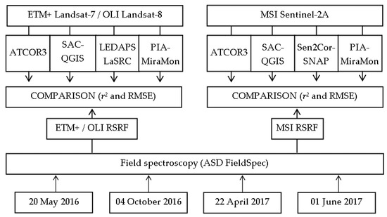 General workflow, for a given date, of radiometric correction methods and their comparison with field spectroradiometry data.