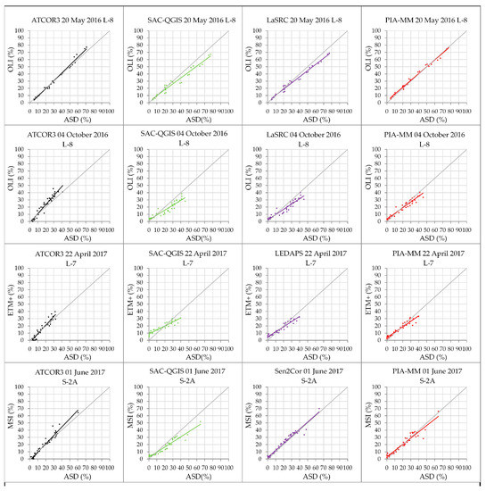 Landsat-8 imagery acquired on 20 May 2016 yielded an excellent fit with in-situ measurements. 6S-LaSRC had the highest r2 for blue band (0.999), ATCOR3 for SWIR1 bands (0.997) and both tie in the red and SWIR2 bands (0.999, 0.992). PIA-MiraMon, 6S-LaSRC and SAC-QGIS had the best agreement for the NIR bands (0.995) and tie with ATCOR in green band (0.998). When all band samples were grouped together (Table 3), PIA-MiraMon had a superior r2 agreement (0.989), followed by ATCOR3 (0.987), 6S-LaSRC (0.982) and SAC-QGIS (0.961).
