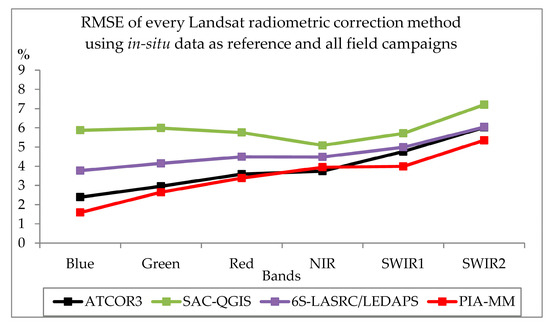 In terms of the differences in reflectance values of all the methods used for Landsat scenes, the PIA-MiraMon radiometric correction had the lowest RMSE values in five out of six bands (visible bands (1.588, 2.645, 3.384), SWIR1 (3.988), SWIR2 (5.350)), while ATCOR3 provided the best result in NIR (3.745). PIA-MiraMon had the best result for all band averages (3.468) (Table 4 and Figure 9).