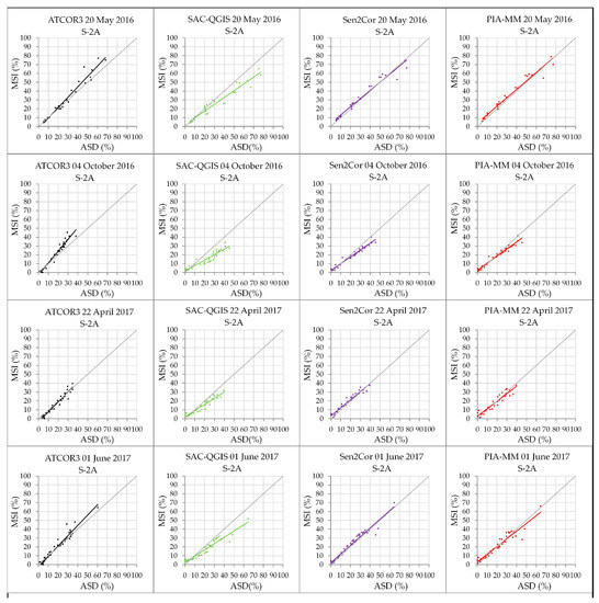 Sentinel-2A imagery that was acquired on 4 October 2016 showed a good fit, with in-situ measurements for all of the bands and for all the methodologies. ATCOR3 yielded the highest r2 for the blue, green, red, NIR, and SWIR1 bands (0.995, 0.994, 0.996, 0.955, 0.975), while for the SWIR2 band, PIA-MiraMon had the highest (0.983). When all of the bands were grouped together, Sen2Cor-SNAP had the best r2 (0.963), followed by PIA-MiraMon (0.958), ATCOR3 (0.952), and SAC-QGIS (0.886) obtained the lowest fit to in-situ data (Table 5).