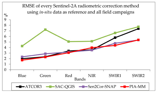 The band-by-band behavior of the PIA-MiraMon method for Landsat imagery (Table 3) shows good agreement, and October is the month with the lowest agreement results. PIA-MiraMon does not fail in any band when Landsat imagery is corrected. Moreover, when the RMSE is considered (Table 4), PIA-MiraMon obtains the lowest differences with respect to the in-situ data in all of the bands, except NIR.