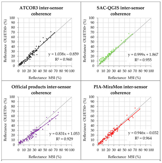 Correlation of Landsat and Sentinel-2A images that were acquired almost at the same time, and corrected with the same method (except for the official products (6S-LEDAPS/6S-LaSRC and Sen2Cor-SNAP)), showed the best coefficient of determination (r2) for PIA-MiraMon in the blue, green, and red bands (0.916, 0.961, 0.966), for SAC-QGIS in the SWIR1 and SWIR2 bands (0.982, 0.972), and for ATCOR3 in NIR band (0.986) (Table 7). When all of the bands were grouped together, the best r2 was found when the PIA-MiraMon method (0.964) was used, followed by ATCOR3 (0.960), SAC-QGIS (0.955), and the official products (0.929), as seen in Figure 12.