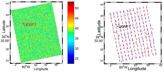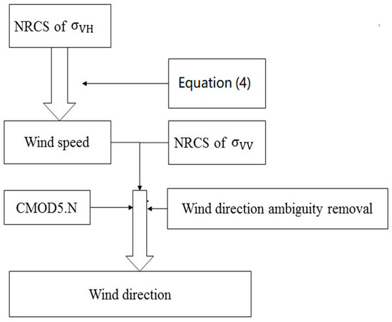 - Firstly, we use the NRCS for VH polarization data to calculate wind speed at 10-m reference height () from Equation (4). Secondly, we use the NRCS for VV data to calculate wind direction with ambiguities from Equation (5). Finally, using the directional ambiguity removal criteria previously mentioned, the final wind directions are obtained without ambiguities.