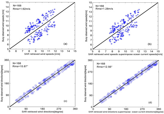 (a) SAR-retrieved wind speeds from C-2PO model compared to wind speeds observed by buoy measurements; (b) SAR-retrieved wind speeds with superimposed ocean current speeds compared to winds speeds observed by buoys; (c) SAR-retrieved wind directions derived from applying the C-2PO model compared to wind directions observed by buoys; (d) SAR-retrieved wind directions with superimposed ocean current directions compared to wind directions observed by buoys.