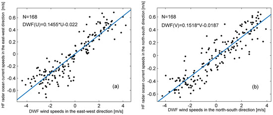 Scatter diagrams between the DWF velocities and HF radar ocean current velocities, in which, U and V represent the east–west and the north–south DWF velocities, respectively; and represent the east–west and the north–south ocean surface current velocities measured by the HF radar.