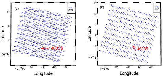 The vector winds retrieved from the SAR images, , are decomposed in the Cartesian coordinate system described above. Thus, the east–west component is and the north–south component is . For vector winds taken from the buoy measurements, , the east–west component is , and the north–south component is . In this paper, the DWF vectors are defined as the differences between the buoy wind field vectors and the wind field vectors retrieved from the SAR images. Therefore, the east–west DWF is , and the north–south differential wind velocity is . Therefore, the resulting speed of the DWF synthesized vector is given by and for direction, (Figure 5b).