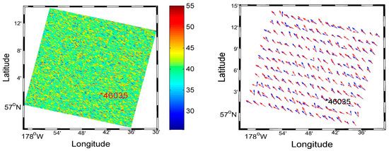 Following our methodology as described above, we first use the quad-polarization SAR image to calculate the complex backscatter coefficients, and , for each pixel. Therefore, the NRCS values are and . The NRCS images in VV polarization and VH polarization, corresponding to the SAR image are shown in Figure 4. The parameters extracted for this SAR image for ocean surface wind fields are as follows: the wind speed and the wind direction . These are shown in Figure 5a.