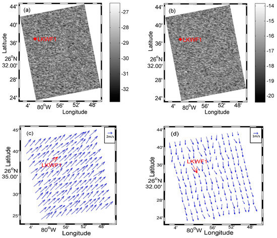 RADARSAT-2 SAR image in the North Atlantic, off Florida, at 02:12:56 on 19 January 2013, collocated with NDBC buoy LKWF1 showing: (a) VH polarization; (b) VV polarization; (c) SAR-derived wind fields; and (d) DWF wind fields.