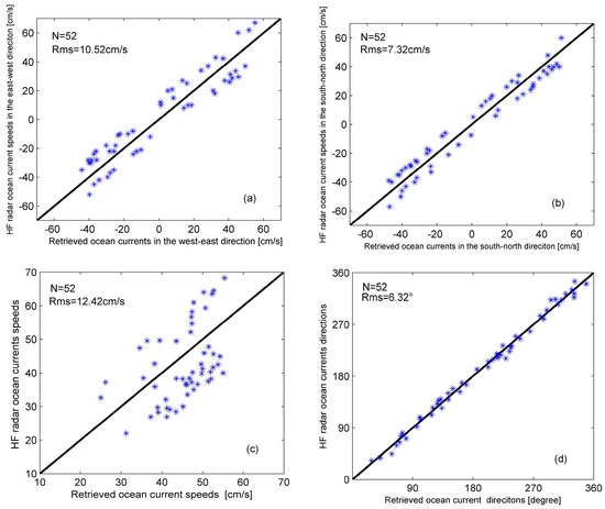 (a) Retrieved ocean surface current speeds in the east–west direction from empirical formulae given in Equations (7) and (8) versus HF radar measurements; (b) Retrieved sea current speeds of south–north direction from empirical formulae in Equations (7) and (8) versus HF radar measurements; (c) Synthetic current speeds in the east–west and south–north direction versus HF radar measurements; (d) Synthetic current directions versus HF radar measurements.