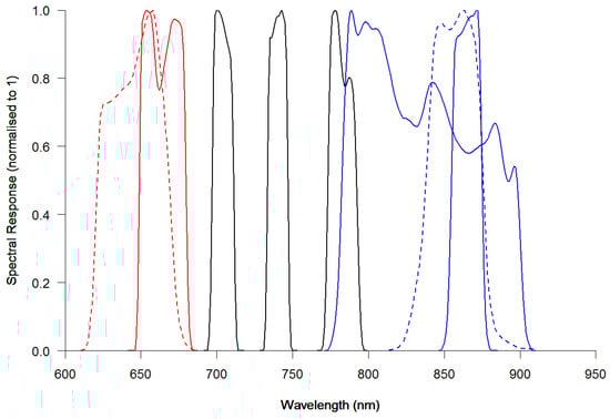 Spectral response functions for the Sentinel-2 MSI (solid, [1]) and MODIS (dashed, [23]) red to NIR wavelength bands. The MSI red-edge bands 5 (705 nm), band 6 (740 nm), and band 7 (783 nm) are shown in black. The MSI bands (in order of increasing central wavelength) are band 4 (665 nm), band 5 (705 nm), band 6 (740 nm), band 7 (783 nm), band 8 (842 nm), and band8A (865 nm). The MODIS red (645 nm) and NIR (858 nm) bands are shown by the dashed lines.