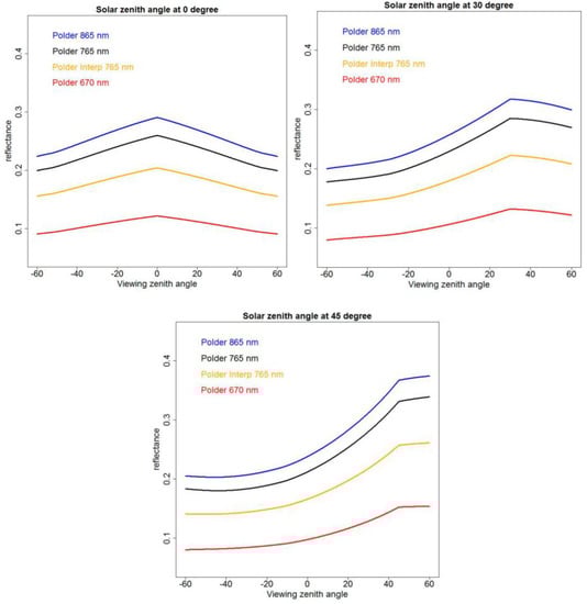 Predicted reflectance (derived as 1) using the fixed global annual POLDER NIR 865 nm (blue), red-edge 765 nm (black), and red 670 nm (red) BRDF model parameters (Table 2) and using the interpolated POLDER red-edge 765 nm (orange) BRDF model parameters. Shown for MODIS or POLDER ± 60° view zenith angle range and for three fixed solar zenith angles (0°, 30°, 45°).