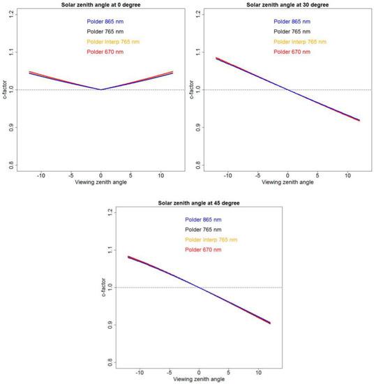 c-factors (derived as 2) using the fixed global annual POLDER NIR 865 nm (blue), red-edge 765 nm (black), and red 670 nm (red) BRDF model parameters (Table 2) and using the interpolated POLDER red-edge 765 nm (orange) BRDF model parameters. Shown for Sentinel-2 MSI ± 10.3° view zenith angle range and for three fixed solar zenith angles (0°, 30°, 45°). The orange and blue lines are almost identical and the blue lines are plotted over the orange lines.