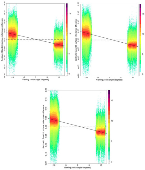 Sentinel-2A MSI red-edge surface reflectance differences in the Southern Africa January swath image overlap zones plotted against view zenith for a total of 6,600,685 pairs of forward and back scatter surface reflectance values. The plot colors show the relative frequency of occurrence of similar difference values (with a log2 scale). The solid lines show ordinary least squares (OLS) linear regression fits of these data (see Table 4). Results shown for MSI bands 5 (705 nm), 6 (740 nm), and 7 (783 nm).
