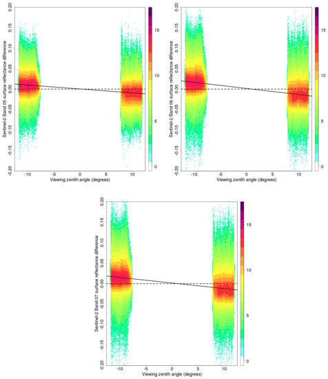 Figure 4 and Figure 5 show scatterplots of the MSI red-edge band surface reflectance differences as a function of view zenith for the 10-days of January and April data, respectively. In each period, pairs of MSI observations sensed in the forward and backward scatter directions over the same location were compared. The plots were generated using the same method as [12], but are shown here for the MSI red-edge bands. The figures show the surface reflectance differences for each pair plotted as a function of the view zenith angle. The view zenith BRDF effect across the Sentinel-2 field of view is evident for all three red-edges bands and in both months. The view zenith BRDF effect is greater in January than in April because the January data were sensed close to the solar principal plane when BRDF effects are pronounced and the April data were sensed closer to the orthogonal plane where BRDF effects are less pronounced. This is reflected in the slopes of the OLS regression lines that are significant for all bands and both months (p-values < 0.0001) and have higher r2 values (>0.7) for January than for April (>0.3) (Table 4). The B-F difference, i.e., the OLS slope term multiplied by the maximum observed view zenith range (23.86°), quantifies the average difference between surface reflectance in the forward and backward scatter directions at the MSI scan edges. The B-F differences for all three red-edge bands are about 0.07 to 0.08 (January) and 0.02 to 0.03 (April) (Table 4).