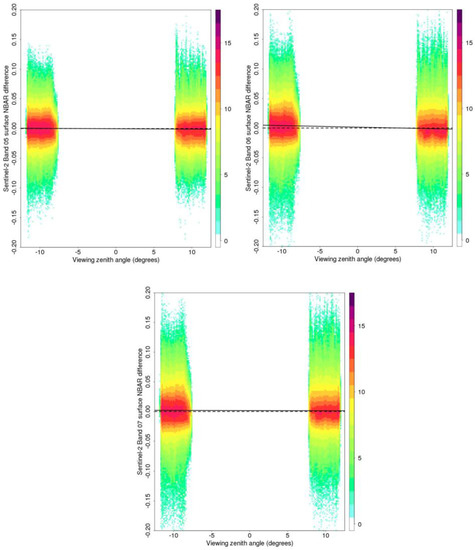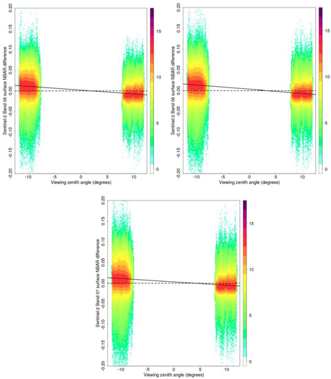 Sentinel-2A MSI red-edge surface NBAR differences in the Southern Africa January swath image overlap zones plotted against view zenith for a total of 6,600,685 pairs of forward and back scatter surface NBAR values. The plot colors show the relative frequency of occurrence of similar difference values (with a log2 scale). The solid lines show ordinary least squares (OLS) linear regression fits of these data (see Table 6). Results shown for MSI bands 5 (705 nm), 6 (740 nm), and 7 (783 nm).