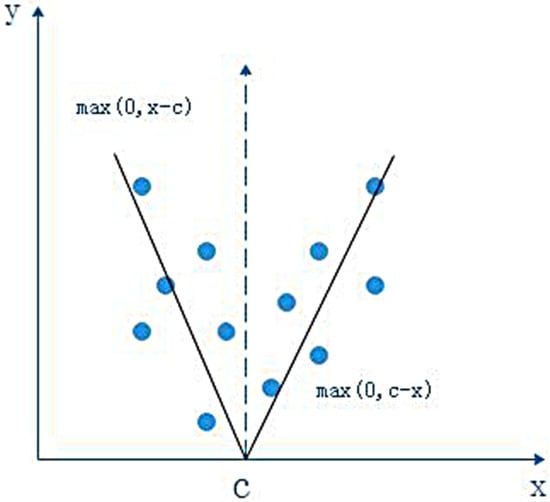 Here, the summation is over the k non-constant terms in the model. is the intercept parameter. Each is a constant coefficient, is a basic function, which takes one of following forms: a constant 1, a hinge function or two or more hinge functions. A hinge function (Figure 3) has the form or , c is a constant, called the knot.