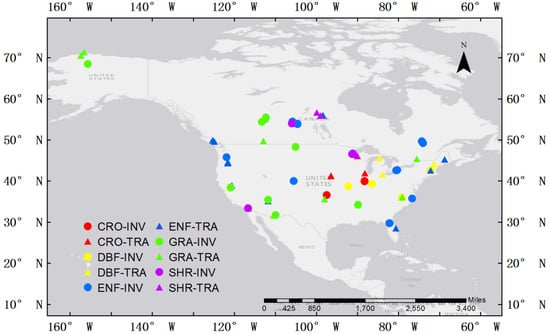 Location of the 85 eddy covariance flux towers used in this study. INV means the data of this site were used to inverse, TRA means that the data of this site were used for training.