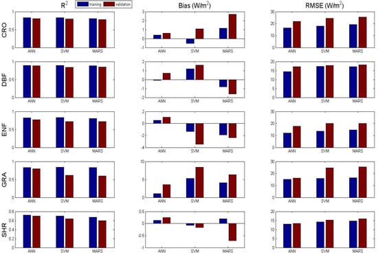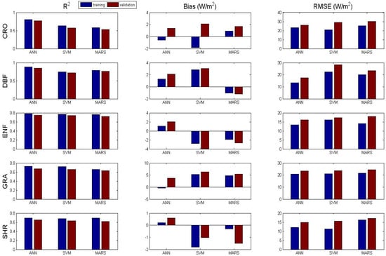 Figure 7 shows the training and validation statistics R2, bias, and RMSE of the three algorithms that are driven by MERRA meteorology for five PFTs. The value of R2 was lower and RMSE was higher when compared to the results that are driven by tower-specific meteorology. With similar results being shown in Figure 5, the ANN demonstrated the best performance among the three machine learning algorithms at both the training and validation stages. The biggest difference, however, was that the ANN performed absolutely higher R2 than any of the other algorithms in Figure 7, while the R2 is very close among the three algorithms in Figure 5 for CRO and DBF. Since the only difference in input was meteorology data, the most likely reason that the ANN performed better than than SVM and MARS when using inaccurate input variables (besides MERRA meteorology data being more inaccurate than the tower-specific meteorology data) has to do with the ANN’s own characteristics. As for bias, ANN performed much better than the others, while SVM showed the poorest performance for most PFTs. As for RMSE, results of SVM may be a little better than results of MARS for some PFTs, but on the whole, their performances were similar.