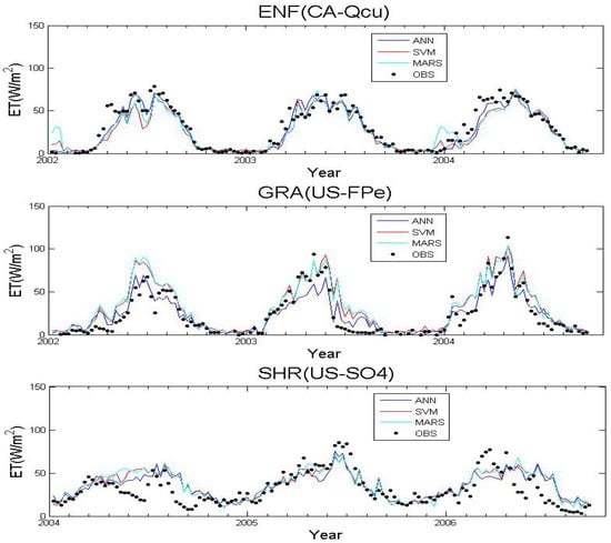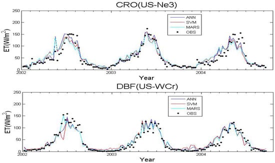 Figure 6 shows that the three algorithms exhibited most features of measured LE seasonality in the observed inversion data for different PFTs. We randomly selected an inversion site that has at least three years of complete ground-measured data for each PFT, and then chose three years of complete ground-measured data and the corresponding estimated LE data using three machine learning algorithms. We plotted the eight-day average LE to replace daily LE data. Five sites were US-Ne3 (CRO), US-WCr (DBF), CA-Qcu (ENF), US-FPe (GRA), and US-SO4 (SHR). We compared the estimated LE with the observed LE in 2002–2004 except at US-SO4, for which we used the period 2004–2006. In comparison to the other two algorithms, the ANN algorithm produced seasonal LE variations that were closest to the observed LE. Estimated LE showed great consistency, with observed LE in lower values for all of the PFTs in Figure 6, but for GRA land cover type, the ANN and the SVM kept the same trend, while the results of the MARS were absolutely lower than result of the ANN, the SVM and observed LE in high value area. We also found some abnormal observed LE value in 2004 for SHR, which may lead to the inaccuracy of estimation results.