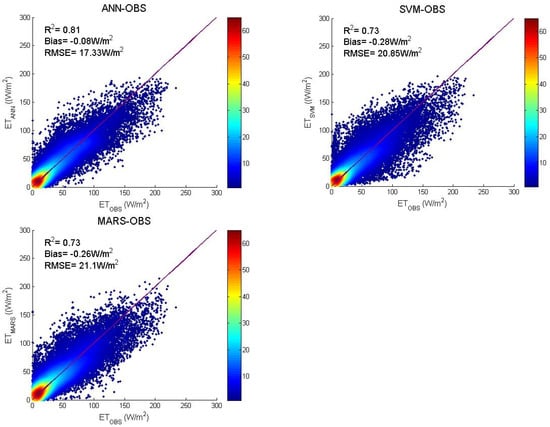 Our study, based on the estimated daily LE at 85 EC flux tower sites using different machine learning algorithms that were driven by tower-specific and MERRA meteorology, illustrated that the ANN algorithm yielded the best LE estimate. The ANN had the highest R2 (0.81 and 0.70) (p < 0.01) and lowest RMSE (17.33 and 20.22 W/m2) in comparison to the SVM and MARS algorithms for tower-specific and MERRA meteorological data, respectively (Figure 9 and Figure 10). The results were consistent with the findings of Lu and Zhuang, 2010, which used remote sensing data from the MODIS, meteorological and eddy flux data, and an ANN technique to develop a daily product for the period of 2004–2005 for the conterminous U.S. [49]. They found that the ANN predicted daily LE well (R2 = 0.52–0.86).