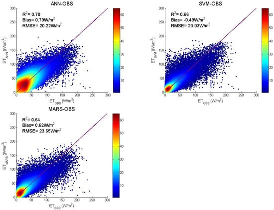 All of the algorithms yielded high annual LE over the east and west coasts of the United States. In the low latitudes, the highest annual LE was approximately larger than 90 W/m2, appearing on the area with latitudes lower than 20°N. The biggest difference between the three algorithms was the ANN estimated higher LE values on the east coast of the United States and lower LE values in areas of the western United States when compared to the SVM and the MARS, which returned similar results.