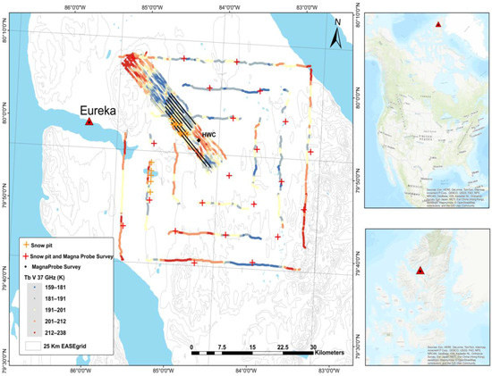 Between 12 and 22 April, two types of snow surveys were conducted along the airborne radiometer flight lines. A regional-scale snow survey covering much of the Fosheim Peninsula was conducted via helicopter, with the purpose of evaluating the variability in snow properties at the 25 km EASE-Grid scale. The regional snow surveys involved snow depth transects and snow pits measuring snow properties including layering, density, temperature and mean geometrical maximum (Dmax) grain size using a field microscope and a 2 mm comparator card, for 22 regional sites (these sites are presented by red crosses in the Figure 1). The regional snow conditions were relatively homogeneous; there was minimal terrain influence (generally flat), and no emergent vegetation above the snowpack was visible [12]. Snow depth was measured using a GPS enabled, self-recording snow depth probe [37], called a MagnaProbe. Depth measurements were made at 5 to 10 m intervals along a 100 m sided-square centered on a snow pit. Total number of snow depth measurements made at each site ranged from 133 to 176 (average of 150) for a total of 2656 snow depths at all 22 sites. These measurements were used to determine the statistical distribution of snow depth at each site. An ESC-30 snow corer with a cross-sectional area of 30 cm2 [38] was also used to record bulk SWE and density measurements at each site three times, for a total of 66 times.