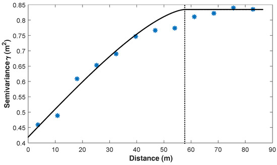 Averaged semivariogram of snow depth values for pairs with a seven-meter lag size and a fitted spherical model (black line). The range (58 m) is indicated by the vertical dotted line.