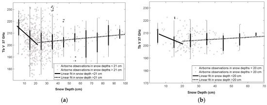 Airborne observations were used first to analyze the emission behavior of tundra snow in the study area. Figure 4 presents Tbs matched with coincident snow depth measurements sampled along the intensive flight paths for low and high altitude flights. In this study, only the vertical polarization at Tb 37 GHz response were studied due to less sensitivity to layering and ice lens structures in the snowpack than horizontal polarization [40,41]. In Figure 4a, each data point shows an average value of minimum 10 MagnaProbe snow depth measurements inside the footprint for a total of 601 Tbs with 6628 coincident depth measurements. When snow depth increases to about 20 cm, the Tb V 37 GHz signal decreases rapidly as scattering dominates the emission signal. Above this depth Tbs increase. To define this inflection point, a simple iterative regression equation search was applied to locate the depth at which the Tb was minimal based on the highest correlation coefficient (R). The best R correlation was −0.4 with a snow depth of 21 cm observed which equals SWE of 65 mm with an average density of 310 kg m−3. At depths exceeding this threshold, Tbs increased, albeit with a relatively weak R coefficient (+0.1), in response to contributions of microwave emission from the snow itself. Both correlation coefficients are significant at the 95% confidence level.