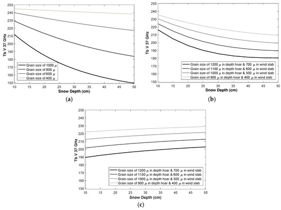 DMRT-ML simulations of the three experiment cases: (a) depth hoar formation simulation using a single snow layer; (b) two-layer snowpack of wind slab and depth hoar with a wind slab to depth hoar ratio of 2:1; and (c) two-layer snowpack of wind slab and depth hoar with static depth hoar of 7 cm.