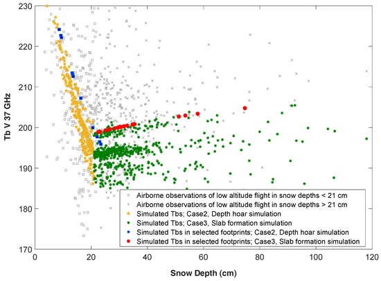 Figure 7 is a repeat of Figure 4a with the Tb V 37 GHz simulations in Figure 6 overlain to show how the depth hoar and wind slab dominated snowpacks control the Tb V 37 GHz emission behavior measured by the airborne radiometer. The plot also includes the model simulations for each airborne radiometer Tb IFOV with a minimum of 10 MagnaProbe snow depth measurements inside. Depth hoar development and wind slab formation were simulated using a two-layer snowpack as presented earlier. KT-19 infrared surface temperature measurements recorded coincidently with each airborne Tb were used as model inputs for snowpack temperatures. The simulation results using the airborne KT-19 snow temperatures inputs produced parallel patterns of simulated Tbs that can be seen in (specifically in the Case 3 wind slab growth simulations). These parallel patterns of Tbs are a result of small variations in KT-19 snow surface temperatures between areas along the flight lines, highlighting the model sensitivity to this input variable. Overall, the model simulations of Tb have a smaller variance compared to observed airborne Tbs due to a smaller range of snow density, and grain size used as model inputs which arises from the generalization process of the in situ snow survey data.