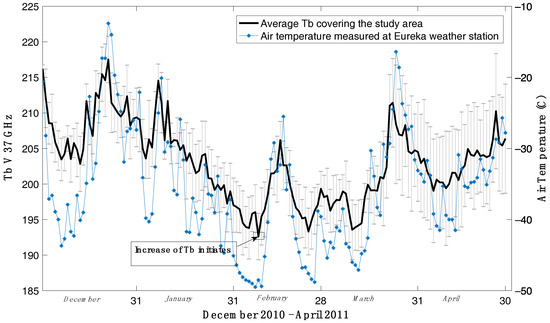 AMSR-E/Aqua Daily EASE-Grid Tbs from 1 December to 30 April were downloaded from the National Snow and Ice Data Center (NSIDC; [36]) to produce seasonal time series of brightness temperatures. The AMSR-E/Aqua Daily EASE-Grid Tbs were produced from the interpolation method of Inverse Distance Square, using AMSR-E/Aqua L2A Global Swath Spatially-Resampled Brightness Temperatures (AE_L2A), projected into EASE-Grid (north and south Lambert azimuthal and global cylindrical) at 25 km resolution [36].