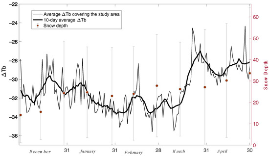 Average of 2 × 2 footprint AMSR-E ΔTb covering the study area, a 10-day average ΔTb and an overlaid local snow depth measurements recorded by Eureka weather station.