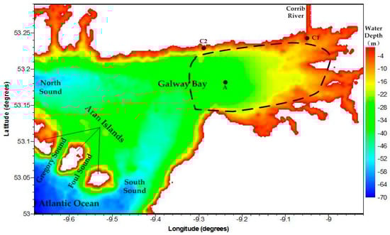 Galway Bay is located on the west coast of Ireland with the bay entrance opening onto the northeast Atlantic Ocean, as shown in Figure 1. The bay is semi-enclosed as it is partially shielded by the Aran Islands [23]. The water circulation through four sounds influences the physics, chemistry and biology of the waters of the bay [24,25]. Oceanic flows enter the bay mainly through the southern sounds; circulate within the bay before exiting through the North Sound [19]. The River Corrib drains approximately 70% of the catchment area around Galway Bay with a mean annual flow of 98.89 m3/s [26], discharging into the inner bay and generally extending seawards along the north coast [27]. The dynamics within the bay are mainly influenced by oceanic flows to the bay from the adjacent shelf and wind driven currents. Meteorological conditions in Galway Bay were mainly influenced by the Atlantic weather system [23]. This is typical of the prevailing weather conditions in Galway Bay. The prevailing wind direction in Galway Bay is from the southwestward. Waters in Galway Bay are well-mixed with no evidence of stratification [28]. Detailed review on hydrodynamic characteristics in this area, see Ren et al. [18] and O’Donncha et al. [19].