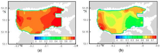 Willmott’s model skill score for the month of December 2011: (a) zonal; and (b) meridional surface velocity component (from O’Donncha et al. [19]).