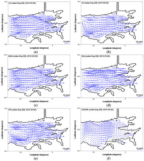 Vector fields of surface currents at Julian Day 228 03:00: (a–d) model DI, OI, NDA and IDA, respectively; (e) model FR; and (f) HFR data.