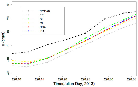Figure 5 shows that the assimilation models were closer to the HFR data (Figure 5f) than the model without data assimilation (FR) at Julian Day 228 02:00. Improvements in RMSE between results from assimilation models and HFR data in model NDA and DI are significant when compared with model FR. Model NDA improved by 10% and 37%, respectively, for surface east–west and north–south velocity components; and model DI by 12% and 37%, respectively, for surface east–west and north–south velocity components. However, the improvement in the RMSE of the surface east–west velocity component in model OI is more significant by 17%, whereas the RMSE of the surface north–south velocity component is improved by 10%. The improvement in the RMSE for the surface north–south velocity component in model IDA is 22%; however, data assimilation caused degradation of the simulation of the east–west surface velocity components in model IDA. This is likely to have resulted due to the application of a constant wind stress during the assimilation of HFR data over the domain; wind stresses actually varied in space over the domain.