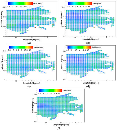 To illustrate the degree of improvement of the data assimilation models over model FR, spatial variations in RMSE between radar data and model results were calculated using Equations (11) and (12) and are presented in Figure 9. RMSE of surface velocity east–west components (u) were firstly calculated at each assimilation point using Equation (11) during the ≥6 h forecasting period (Julian Day 228 02:00–07:00). Equation (11) was also used to compute RMSE values for north–south surface velocity components (v). The total at each assimilation point was then computed using Equation (12). The distribution of across the domain was used to assess the degree of agreement between modelled results and the HFR data.