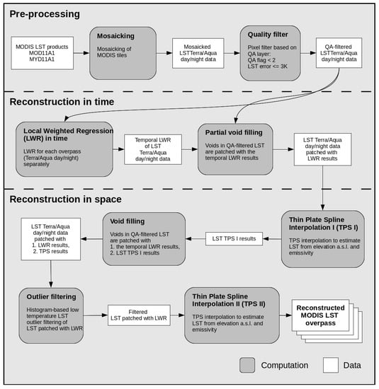 Variation of daily surface temperature can be quite high. Any interpolation in time should therefore allow for fast fluctuations and should avoid smoothing of the time series in order to preserve extreme events. For temporal interpolation we used local weighted regression (LWR; GRASS GIS add-on r.series.lwr [29,30]) with polynomial order 2, considering the five nearest neighbors in time. Since the intra-day and inter-day fluctuations might be mixed up in the interpolation by the existence of any missing values, we treated each daily time step (01:30, 10:30, 13:30 and 22:30) as a separate time series. Intra-day fluctuations in LST can vary considerably among days, i.e., day-time and night-time temperatures can be nearly identical or quite different. Therefore, temporal interpolation of all four daily overpasses together over several days would require a priori assumptions on intra-day fluctuations for each day separately, which are impossible to determine if none or only one observation for a certain day is available. There exist models based on diurnal temperature cycle, but those require several temperature measures per day (see, for example, Liu et al. [32]), which are not available in the case of MODIS sensors. Gaps larger than seven days were not interpolated and left as missing values. We used thin plate spline interpolation (TPS; GRASS GIS add-on r.resamp.tps [29,30]) with elevation data from GMTED2010 and band 31 emissivity from the MODIS LST products as covariates to fill any remaining gaps in space. For details on TPS, see [33,34,35]. Here we used an adaptive window size determined by the spatial distribution of the nearest 150 points. Preliminary tests showed that considering emissivity increased the contrast between urban areas, vegetated areas, and water bodies. Emissivity also exhibited missing values due to cloud cover. However, since emissivity does not change as long as land cover remains constant, it can be easily reconstructed with temporal interpolation. We used LWR with polynomial order 1, using the nearest 7 neighbors in time and filling gaps up to 30 days long to obtain gap-free emissivity that was then used as covariate in the spatial interpolation of LST. Low outliers were defined as values larger than Q3 + 1.5 × (Q3 – Q1), with Q1 and Q3 being the first and third quartile of reference data [5,19]. As reference data we used the time steps of the same day, the last time step of the previous day and the first time step of the next day. The workflow of our MODIS LST reconstruction method is illustrated in Figure 1. Importantly, since valid pixels in the MODIS Land Surface Temperature products represent clear-sky conditions, our reconstruction method as well as most other studies attempting to fill missing values in LST, also represent clear-sky conditions.