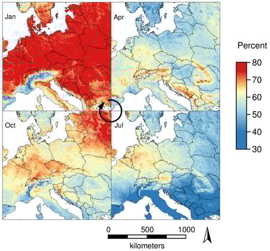 An inspection of months aggregated over all available years showed that most missing values appeared in the winter months November–February (71–74%), and least missing values appeared in the summer months June–September (49–55%). A comparison of missing values in the months January, April, July, and October (average over all years) revealed that not only the percentage of missing values but also their spatial distribution differs between months (Figure 2). In January (74.4% missing), most missing values appeared in lowland areas (up to 1000 m a.s.l.). In April (56.9% missing), most missing values were observed at higher altitudes. In July (49.8% missing), the lowest percentage of missing values appeared in southern Europe and, in October (62.3% missing), a high percentage of missing values appeared in north-eastern Europe and parts of France, Switzerland, Germany, and Austria. The seasonal differences in the amount of missing LST values is most probably caused by climate conditions of the current region (central Europe). For other parts of the world, different seasonal patterns in the amount of missing LST values are to be expected. To understand if missing values were equally common and equally distributed in different times of the day, the number of missing values was counted for each pixel and each time of the day over all processed days (Figure 3 with 01:30 and 13:30). High altitude areas such as the Alps showed few (<40%) missing values at night and average (50–60%) missing values during the day, while northern parts of central Europe had about 10% more missing values during the day than at night.