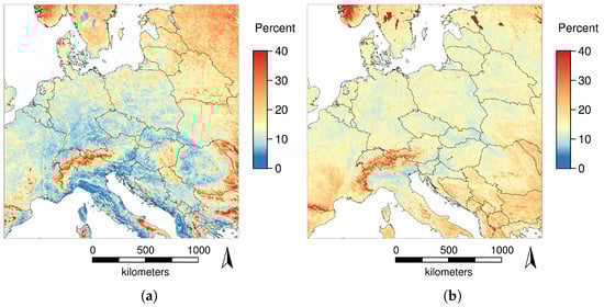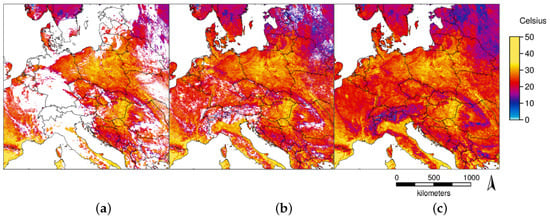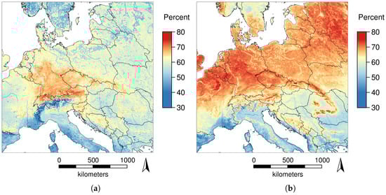 For the four tiles covering central Europe during 2003–2016, 61.4% of the temperature values were missing from the original MODIS LST collection 6 products (after filtering with the corresponding QA flags as described in the Methods Section 2.2). The smallest percentages of missing values occurred at high altitudes and along edges of water bodies. The water bodies themselves had a slightly higher percentage of missing values than their edges, probably due to fog over water bodies. The highest percentage of missing values appeared in low-lying inland areas away from oceans such as central Germany.