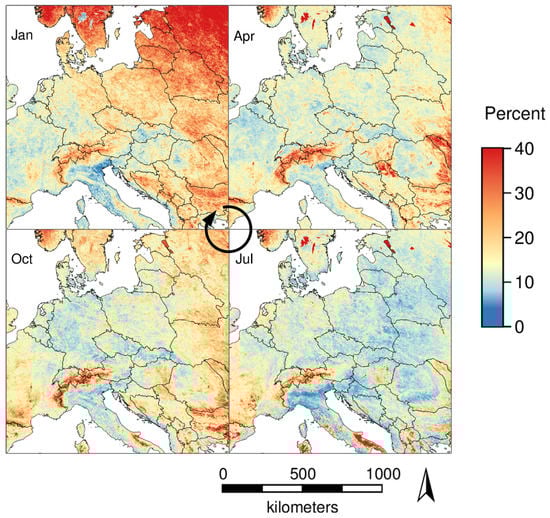 Figure 5 shows a comparison of the percentage of outliers in the months January (5.2% outliers), April (6.4% outliers), July (6.4% outliers), and October (6.0% outliers) aggregated over the years 2003 to 2016. In January, most outliers appeared in northern and north-eastern Europe. A notable exception are water bodies where only few outliers were detected. In April and July, the highest percentage of outliers appeared at high altitudes and over water bodies. In October, outliers appeared at high altitudes and also in eastern and northern Europe, while water bodies did not show peculiar percentages of outliers.