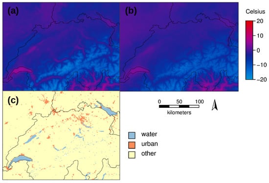 Results of LST reconstruction for January 2015: (a) with emissivity as additional variable; (b) without emissivity (c.f, old “EuroLST” from [5]); and (c) corresponding land cover types. The displayed area covers Switzerland and parts of France and Germany. The slightly higher temperatures of urban areas are represented, and water bodies are more clearly delineated when considering emissivity.