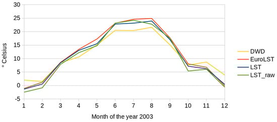 Comparison of monthly averages for 2003 for Bonn, Germany from the new LST reconstruction (LST), the old LST reconstruction (“EuroLST” data, [5]), the original LST values of the MODIS 11A1 products (LST_raw), and air temperature from ground station records from the German Weather Service (DWD).
