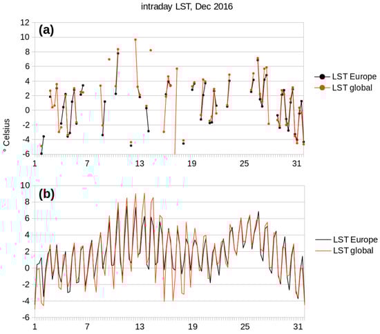 LST time series for Bonn, Germany, in December 2016, for central Europe (black) and globally (red) with: (a) original LST values; and (b) reconstructed LST values. Time steps per day correspond to MODIS overpass times: 01:30, 10:30, 13:30 and 22:30.