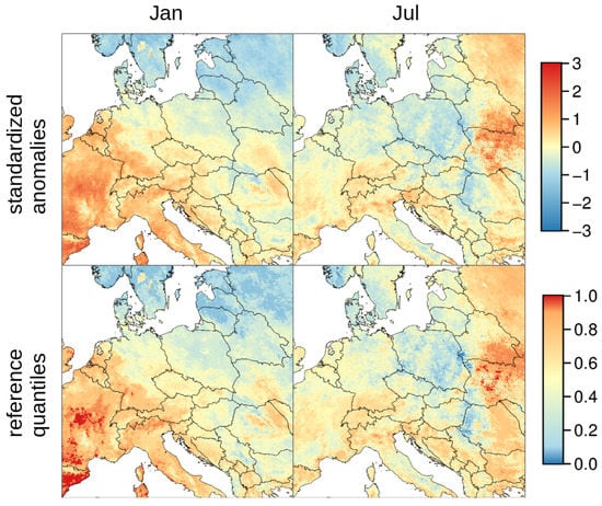 Comparison of January and July 2016 LST to the reference time series given as numbers of standard deviations from the long term average (intensity) and as corresponding quantiles of the reference time series (rarity).