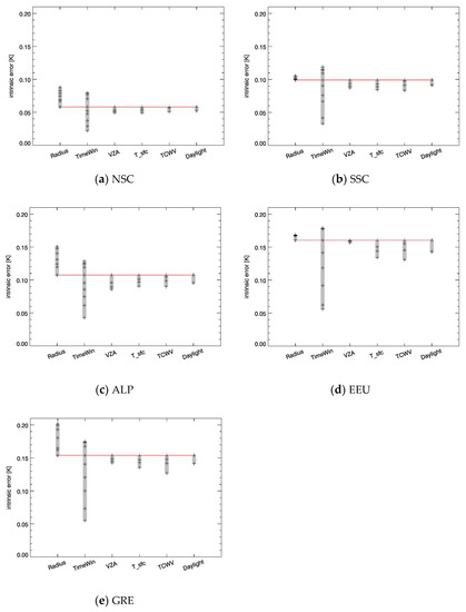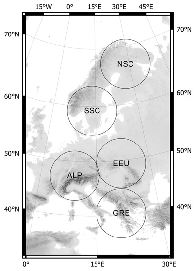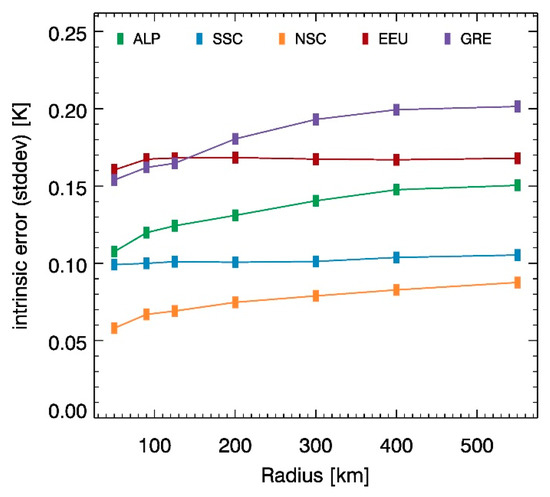 For regions with intrinsic errors that were identified to be more sensitive to changes in radius values (NSC, ALP, GRE), a strong increase in intrinsic error for lower radii up to about 200 or 300 km is observed; after this range of values, the intrinsic error tends to stabilize (Figure 4). For the EEU region, the increase in the sensitivity of intrinsic errors to changes in radius values occurs between 50 km to 90 km, then stabilizes for larger region sizes. For the SSC region, the intrinsic error remains stable over the whole range of tested radius values.