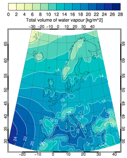 Average of the total content of water vapor over Europe for the period 2000–2012. (ECMWF ERA-INTERIM data set [30]).
